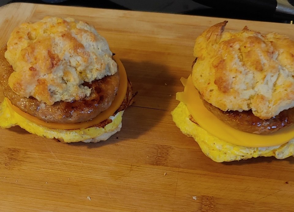 All is not lost. If you have gotten this far, I did make breakfast this morning! Using a couple of leftover biscuits, a couple of sausage patties, a couple of eggs, and a couple of slices of cheese – I whipped up a couple of breakfast biscuits.