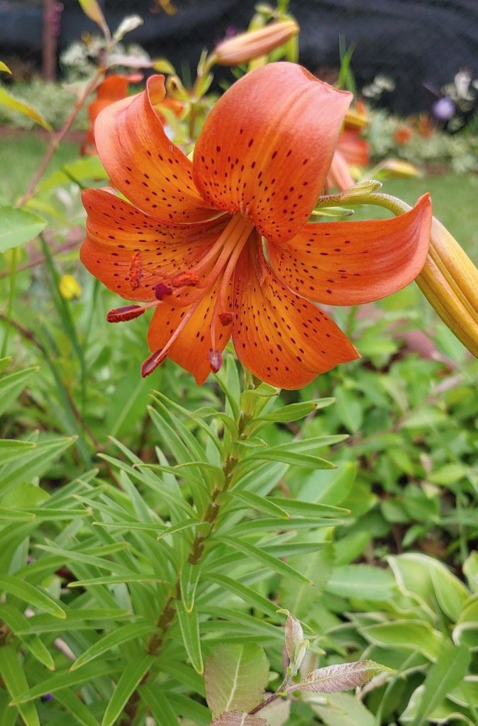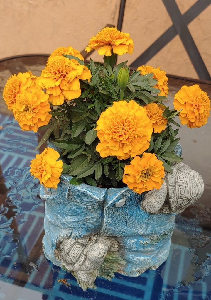 We had to replace our little Buddha this year as the last one did not survive the winter.Our current bush is covered with berries. They will change color and then disappear. Squirrels? Birds? Kids? We have no idea and neither of us eat them, so whatever.I have dug out hundreds of these lilies over the year but they are incorrigible. MarigoldsPansiesNo idea – I planted mixed wildflowers under the birdbath.More wildflowers PetuniasAs is this!And this!And a few California Poppies
