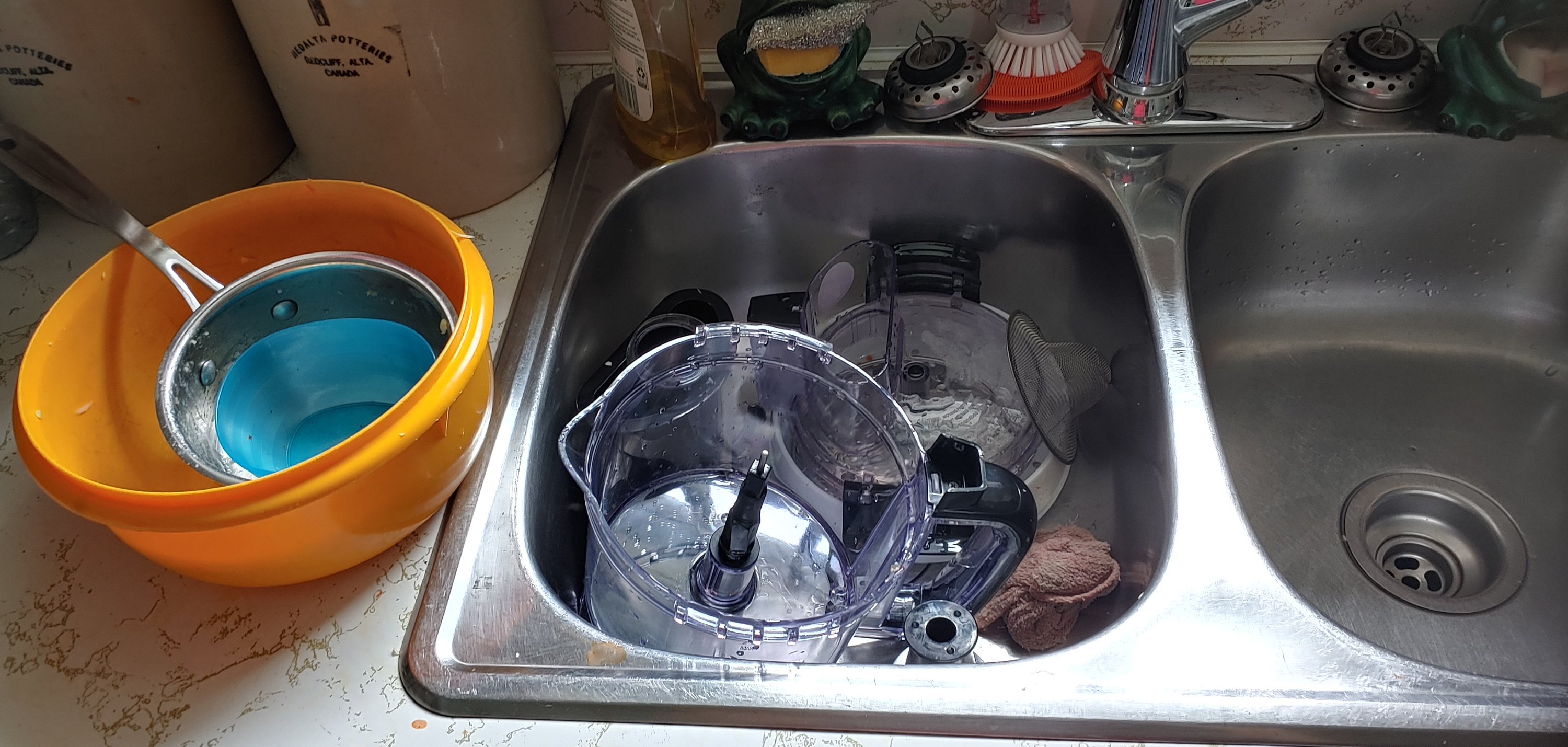 Ready to supervise…Pasta in chicken broth with gelatin and chicken giblets – photo is a bit steamy😊Carrots, turnip, cabbage, parsnips, rhutabega, cabbage and zucchiniParsley, cilantro, lemon balm, and oreganoAdd a dash of black pepper, Hungarian paprika, and cayenne. Cool before portioning and packaging.And cleanup 🙄That was exhausting 😴