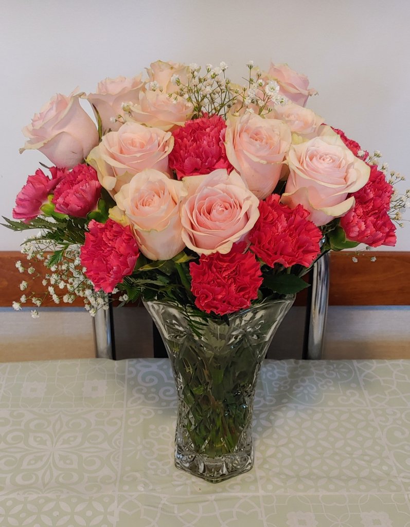 By the next Christmas, I was no longer at the millwork shop, Dan and I were family, and he had learned that pink roses were my absolute favourite (red roses my least) and that I kept a red carnation on my kitchen windowsill for my father, who had passed away days before Christmas a few years previously to this. On Christmas Eve, Dan arrived home with a bouquet of pink roses accented by one red carnation.