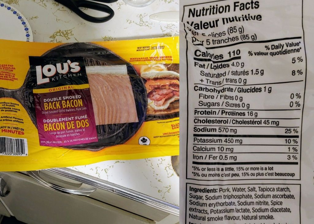 *** I am not a fan of back bacon. It does not taste like bacon and while it looks like ham, it doesn’t taste like that either. That being said, I spoke to a dietician a few weeks ago and she suggested I try using it occasionally as a substitute for real bacon. Dan brought home a package of Lou’s Kitchen back bacon and surprisingly we don’t mind it at all. It’s not bacon, but it is pretty doable – and the nutritional values are amazing. 110 calories for FIVE slices and only 8% daily value of saturated fat. 570 g of salt is pretty bad but I only use 3 slices per breakfast sandwich and we only indulge once or twice a month.