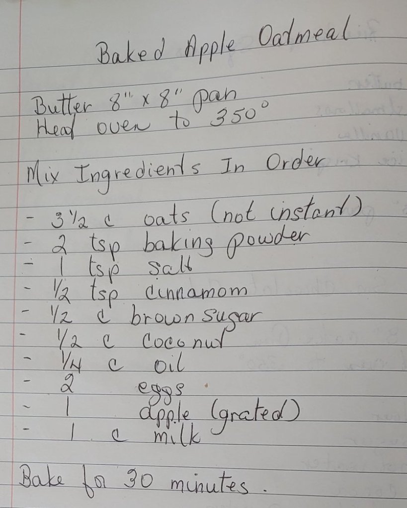 Forgetting that I still hadn’t cleaned the burnt cheese out of the oven, I decided to try making Baked Oatmeal. I have been looking for a quick hardy breakfast that I could have before walking Molly in the morning. I do not like the consistency of Oatmeal Porridge but I like the taste of oatmeal so I thought this would be worth a try.