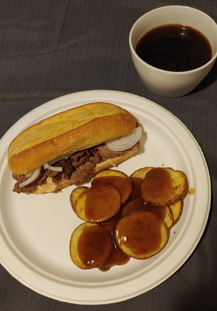 Shaved roast sirloin with onions and horseradish on Villagio buns, served with air fried sliced potatoes, gravy, and au jus.