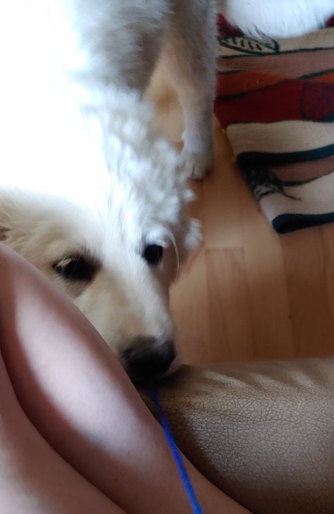 Looking back through photos I have taken of her in the past couple of months, since she has been with us, it is amazing how she has grown and changed. She is still a baby, but she is getting bigger, more independent, and smarter every day! And… more helpful. She definitely likes to help! Last night she tried to help me take a metal splinter out of Dan’s leg. Somehow, having a big white fuzzy head between me and the magnifying glass did not help. 🤦