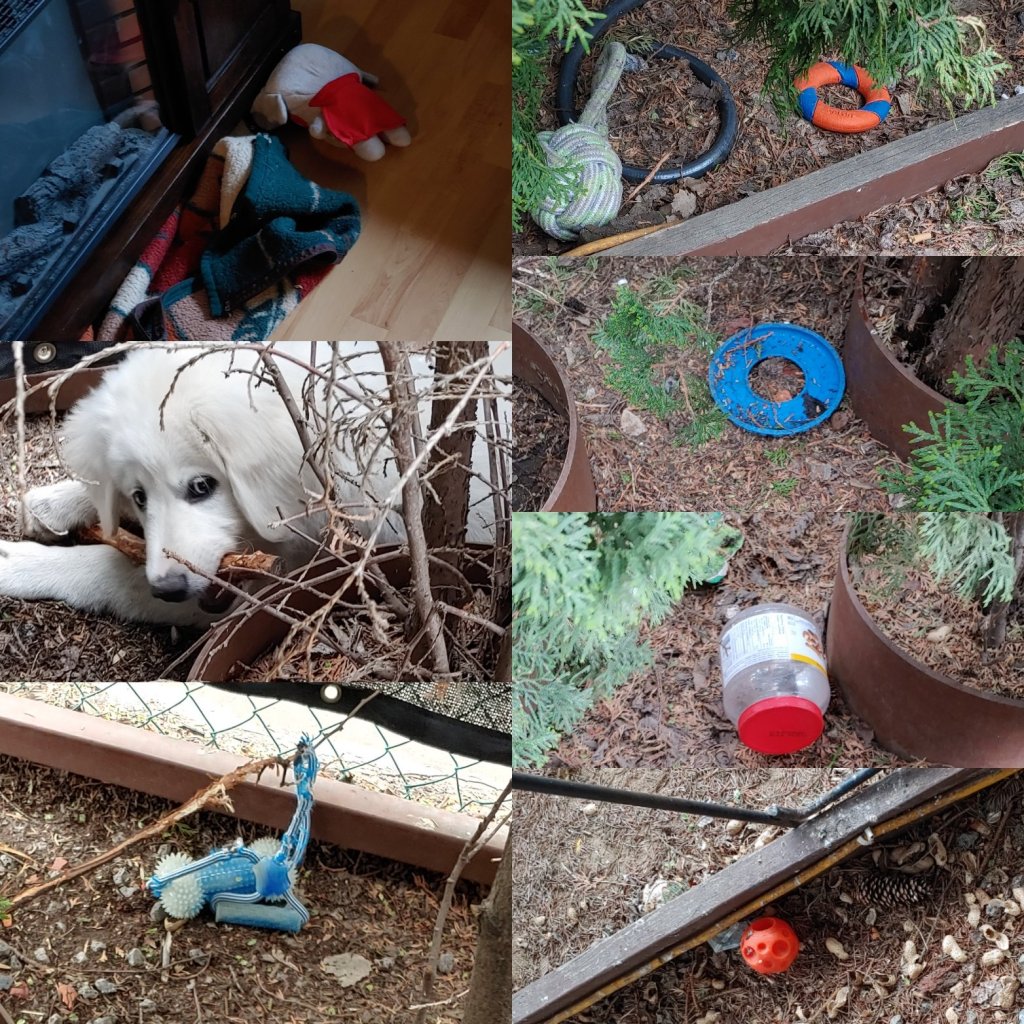 AND – She has learned which cupboard holds our dishcloths and towels, how to get them all out at once and how to transport them to various yard locations before I can catch her.