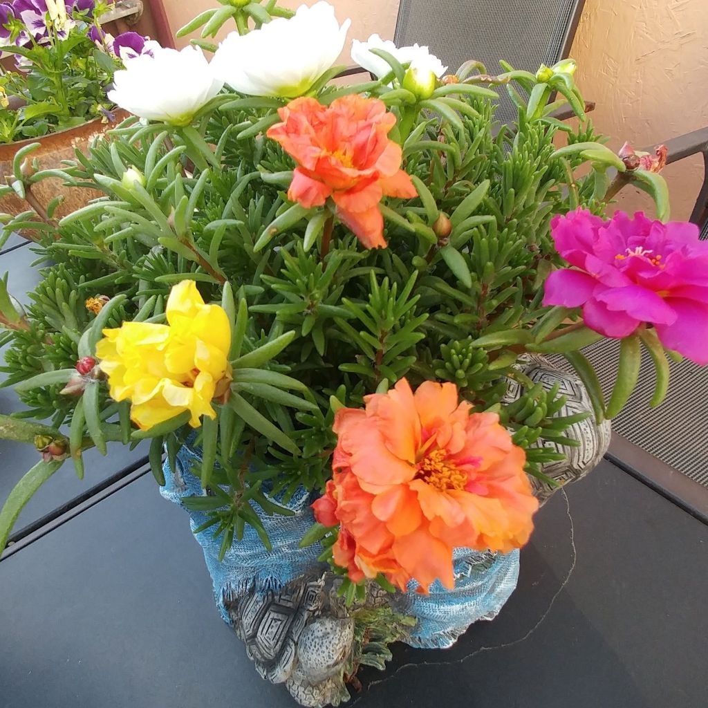 I finished cleaning up the sand in our Molly proof garden. I still have the planters to paint. Dan set out the birdbath, his Toronto Maple Leaf gnome and helped me put up some protection for the beets (that the birds seem to think I plant for them). Dan keeps the front lawn mowed.The other side of the front lawn, a couple of flower beds, and the Blue Spruce that grows taller and spreads wider every year. Our annual Welcome basket of Pansies.